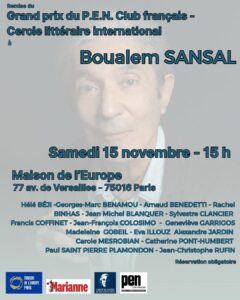Le Grand Prix du P.E.N. Club français – Cercle littéraire international – est attribué à Boualem Sansal, à la veille du premier anniversaire de son arrestation arbitraire à Alger, survenue le 16 novembre 2024.