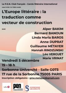 Cette table ronde  explorera le rôle central de la traduction dans la création d’une identité culturelle et littéraire européenne partagée. La traduction n’est pas seulement un instrument de communication entre langues, mais un véritable vecteur de circulation des idées, des imaginaires et des styles littéraires à travers l’Europe. Elle participe ainsi à la construction d’un espace littéraire transnational, où les échanges et les influences mutuelles façonnent une Europe plurilingue et pluriculturelle.