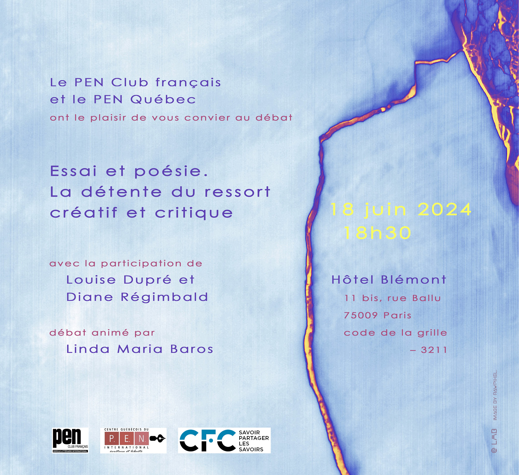 PEN Québec invité au Pen Club françaisLe PEN Club français et le PEN Québec ont le plaisir de vous inviter au débat Essai et poésie. La détente du ressort créatif et critique qu’il organisera le 18 juin 2024, de 18h30 à 20h00, dans le salon de réception de l’Hôtel Blémont (11 bis, rue Ballu – 75009 Paris), débat qui sera non seulement ... Lire la suite