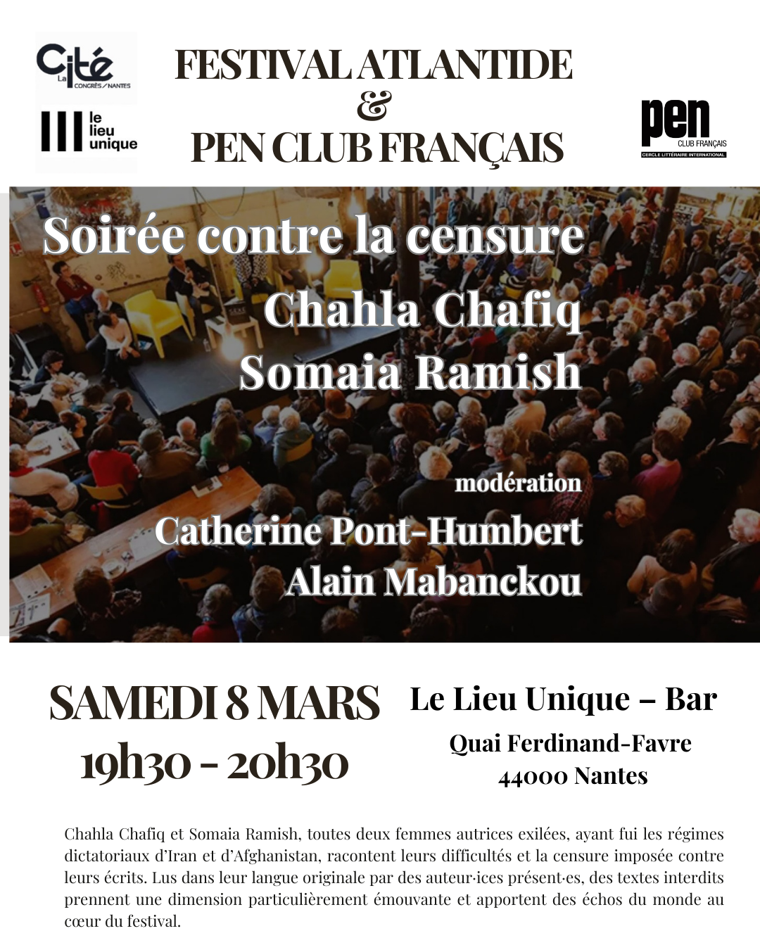 Soirée contre la censure dédiée à Chahla Chafiq et Somaia RamishTemps fort du Festival Atlantide, cette soirée invite à la découverte de textes méconnus, voire inconnus, car censurés lors de leur parution. Dans le bar, lieu vivant, convivial et propice aux échanges, les conversations se tissent et célèbrent ce droit, pilier de la liberté d’expression, qu’est la liberté d’écrire, trop souvent malmenée partout dans le ... Lire la suite