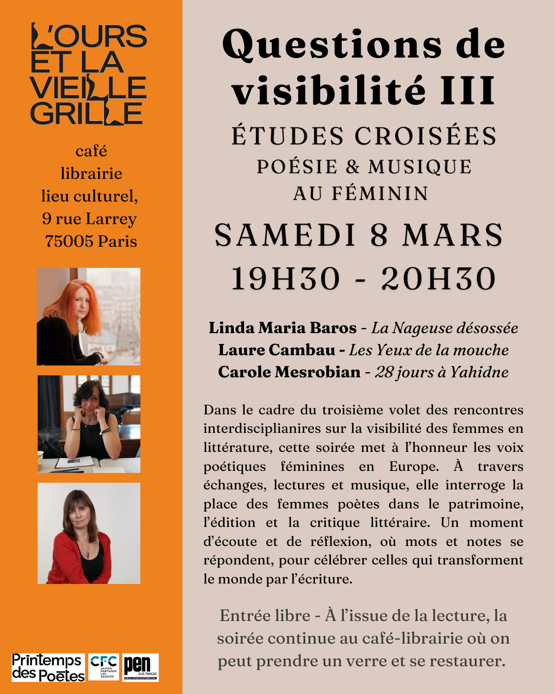 Poésie et Musique au FémininDans le cadre du troisième volet des rencontres interdisciplinaires sur la visibilité des femmes en littérature, cette soirée met à l’honneur les voix poétiques féminines en Europe.